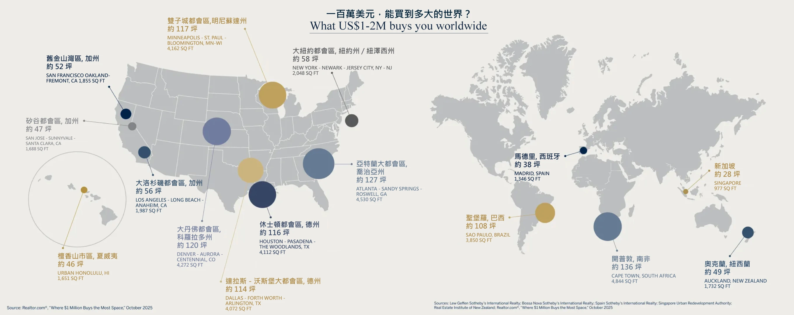 憑藉遍布全球 80 多個國家與地區的頂級不動產網絡,蘇富比國際房地產得以提供更完整的全球觀察。根據其遍及五大洲、五個核心豪宅城市的聯盟夥伴數據顯示,南非開普敦以驚人的空間表現居於首位,100 至 200 萬美元通常可購得約 4,844 平方英尺 ( 約 136 坪 ) 的住宅,甚至超越亞特蘭大的中位數水準。
