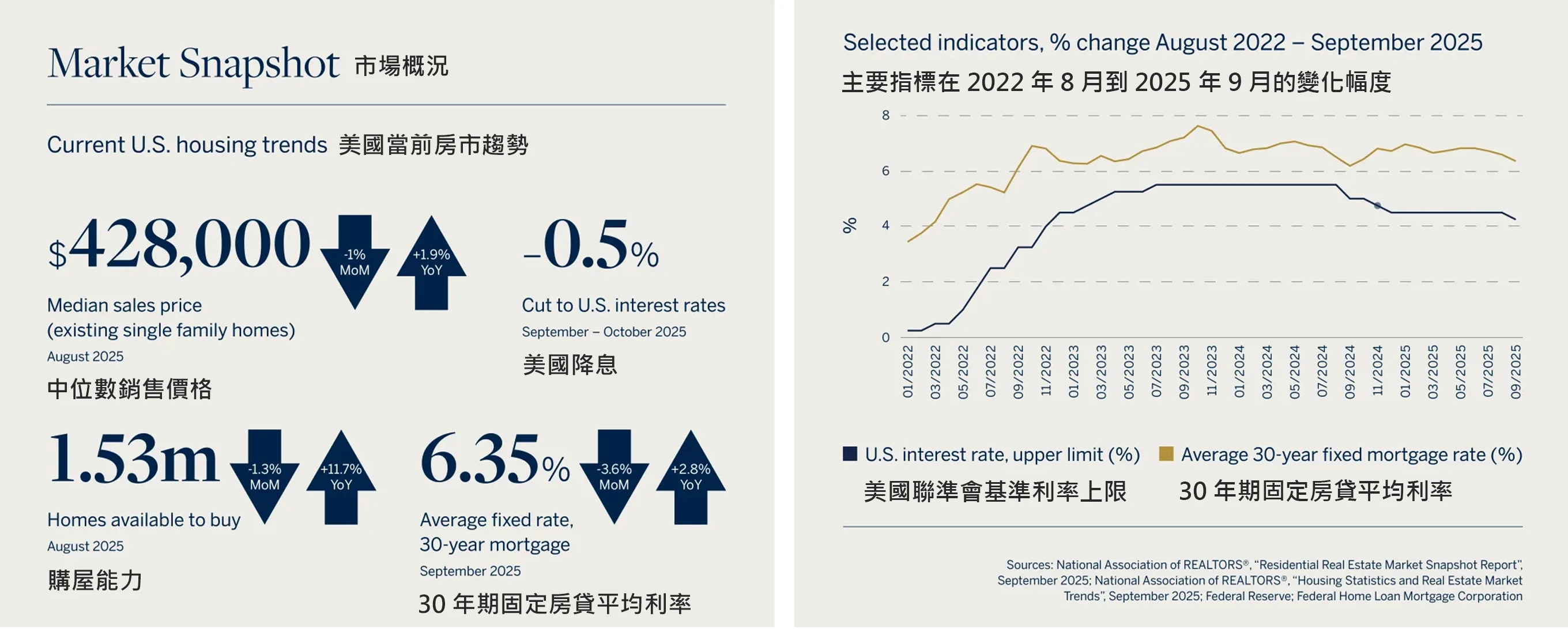 同時,房價漲幅維持平緩:NAR 於 9 月公布的「 成屋銷售 」數據顯示,2025 年 8 月全美單戶成屋的中位數售價為 427,800 美元 — 年增僅 1.9%,較 7 月下降 1%。