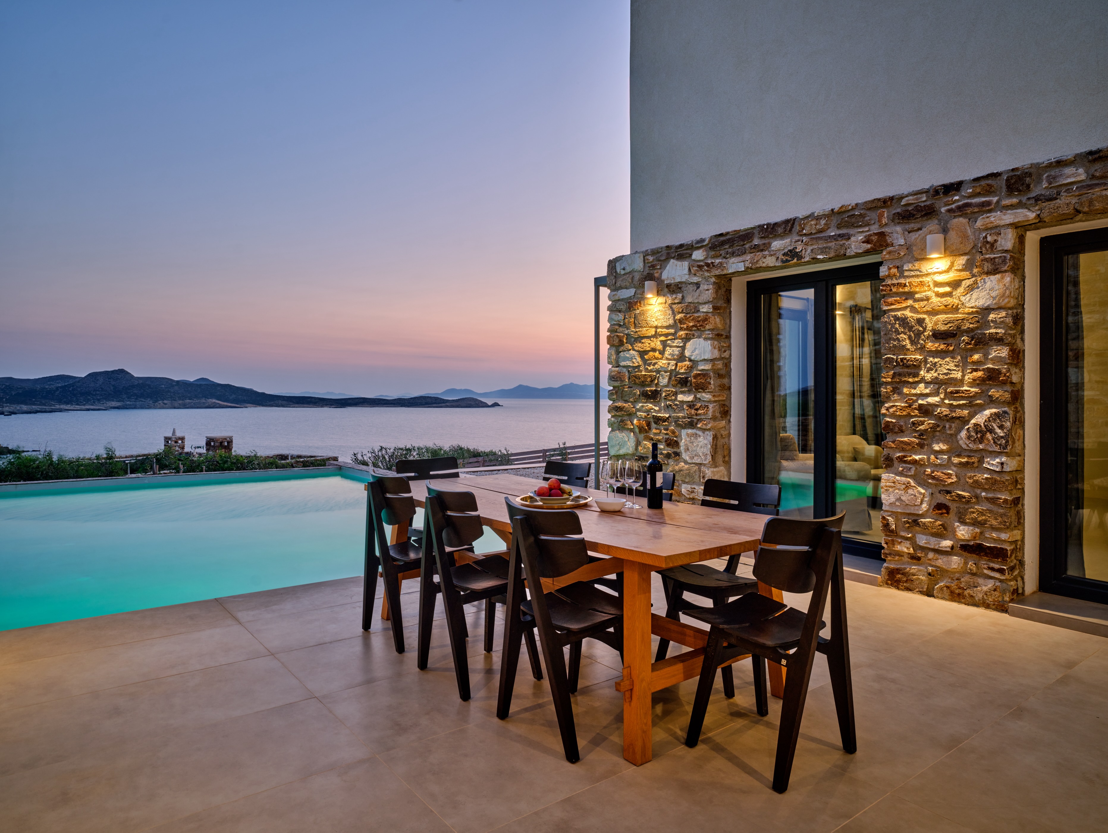 Villa Calma offers captivating sea views and vistas of Despotiko Island. The open layout connects the kitchen, living, and dining areas, flowing seamlessly into the inviting pool area, making it ideal for both entertaining and relaxed family gatherings.