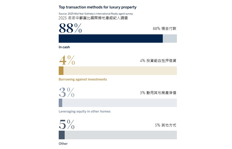然而在當前高利率環境下,富裕買家傾向於直接付現購置房產。根據 2025 年中的蘇富比國際房地產經紀人調查,全球 88% 的高資產淨值人士 ( HNWI ) 客戶選擇以現金支付。