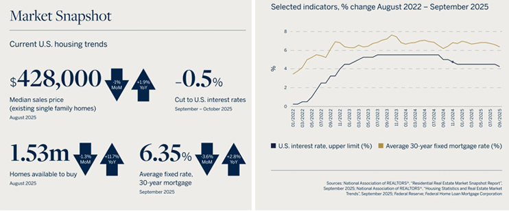 Meanwhile, home pricing has been subdued: NAR’s September-published “Existing-Homes Sales” data shows the median sales price for existing single-family homes was US$427,800 in August 2025—up just 1.9% year-over-year and 1% down from July.
