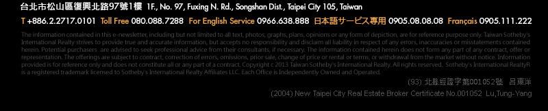 If you prefer not to receive promotional email from Taiwan Sotheby's International Realty, please click here.